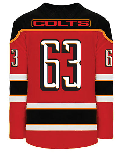 Front features the Colts tricircle logo with the number "63" on the sleeves. Back includes large “63” number and block “COLTS” lettering across the shoulders. Made from sublimated midweight AirKnit moisture-wicking fabric (100% polyester).