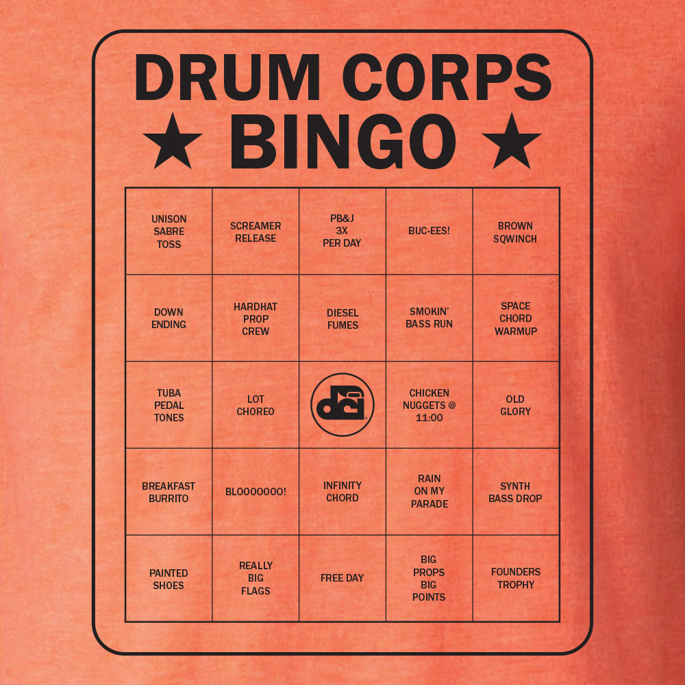 Get out your bingo card and see how long it takes to get your first B-I-N-G-O on the DCI summer tour! Shirt is printed in black ink on a Gildan Heavy Cotton, Sunset garment.